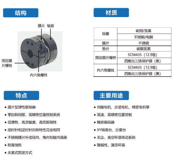 DFPS-C系列聯(lián)軸器采用碳鋼發(fā)黑,利用脹緊套聯(lián)接的膜片型彈性聯(lián)軸器,廣泛用于伺服電機(jī)、步進(jìn)電機(jī)、精密電機(jī)等。