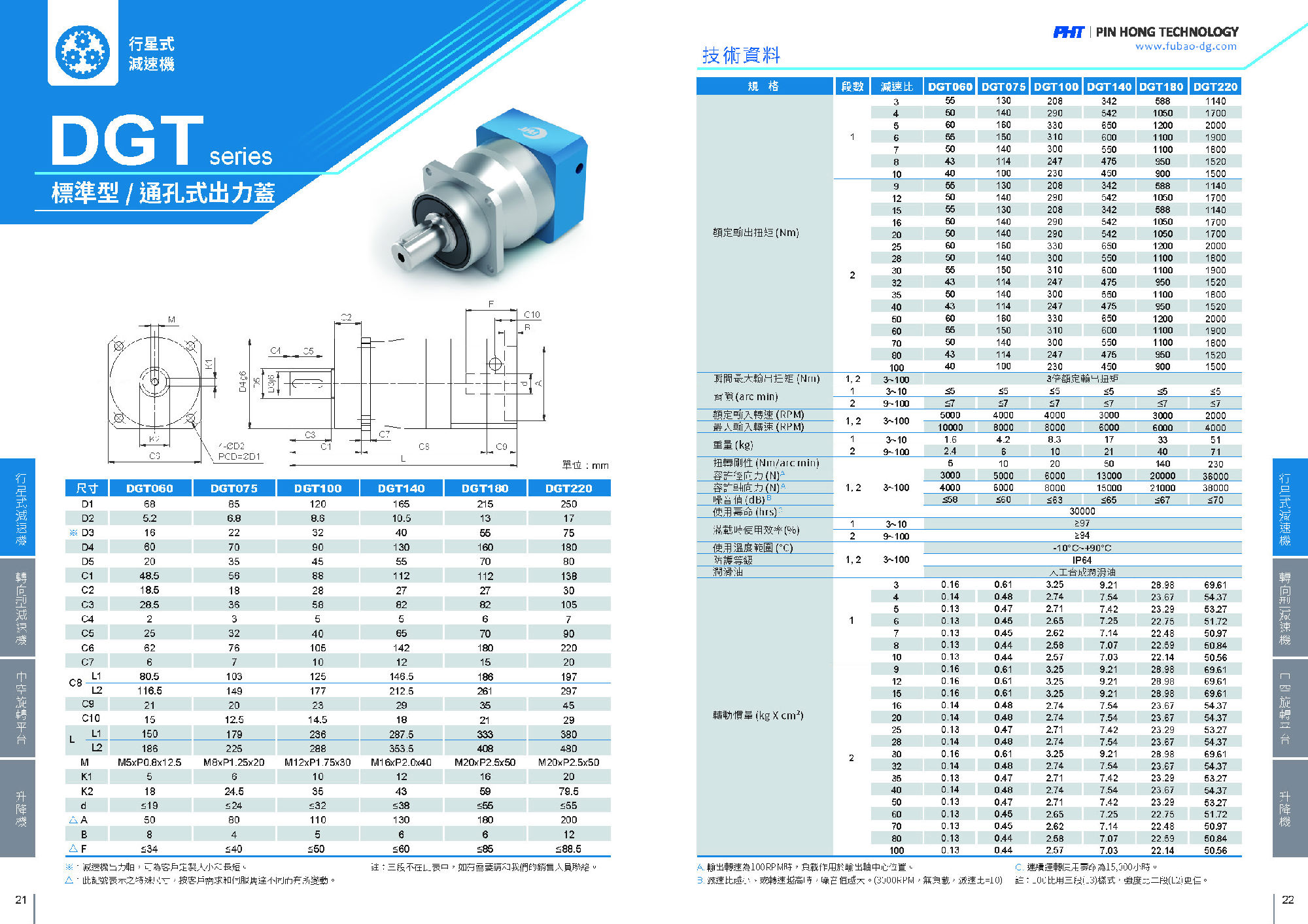 DGT系列是標(biāo)準(zhǔn)型高精度減速機(jī)。 適合精度定位之需求,齒輪采用合金鋼材,內(nèi)部搭配圓錐滾子軸承,使之可承受更佳的負(fù)載,安裝孔位為通孔式。 品宏減速機(jī)的軸承是用NSK品牌的,齒輪經(jīng)過碳化,故精度和剛性都比較優(yōu)越!減速機(jī)出力軸是可根據(jù)客戶的要求去定制大小和長(zhǎng)短的。
