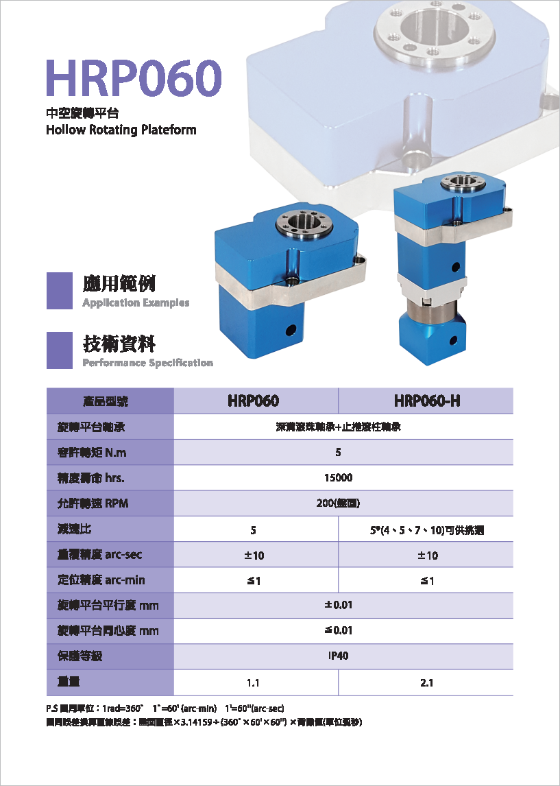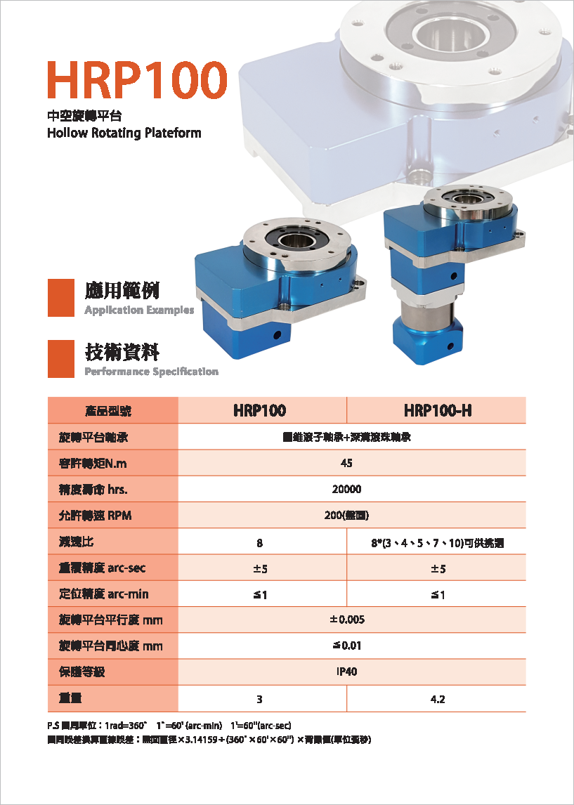 HRP系列是品宏轉角減速機系列。 可搭配伺服馬達或減速齒輪箱,提供使用者多種選擇。 工作平臺可直接與工件配合,提高便利性。 旋轉平臺為中空軸設計,適用于配管之場合。 定位精度小于1弧分,重復精度可達±5弧秒,增加產(chǎn)品之穩(wěn)定性。 各式優(yōu)點可讓產(chǎn)品應用層面更加廣泛。